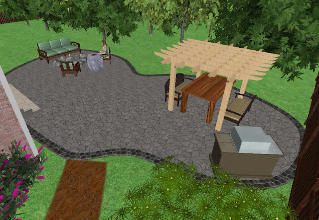 But this weekend, I found a new time waster (not that I have to search too hard to find those...). I downloaded the free trial version of Realtime Landscaping Pro 2013. The full version is $100, and there is a 'Plus' version (instead of Pro) that is $80, but I found the free version suited my needs perfectly... this version was awesome for designing a general landscaping and hardscaping layout - to help me plan where we'd want a patio, walkways, mulch, etc. and to help me visualize what that layout might look like. If you've already got your basic layout and just want to plan more specific details like what kinds of plants you want, then this free version is not for you - the options for specific plants and materials are pretty limited in the trial.